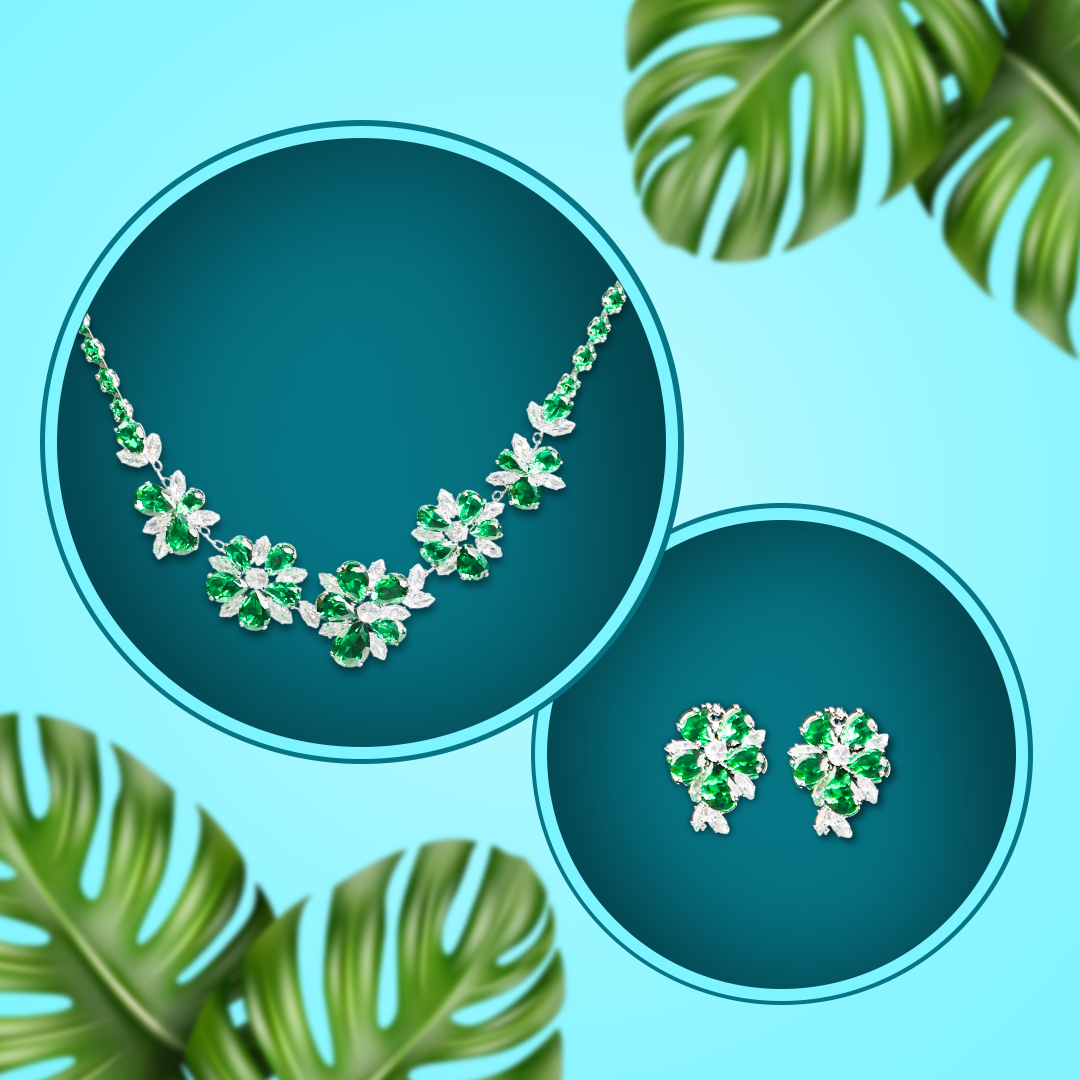 Emerald Crystal Floral Necklace & Earrings Set for Women